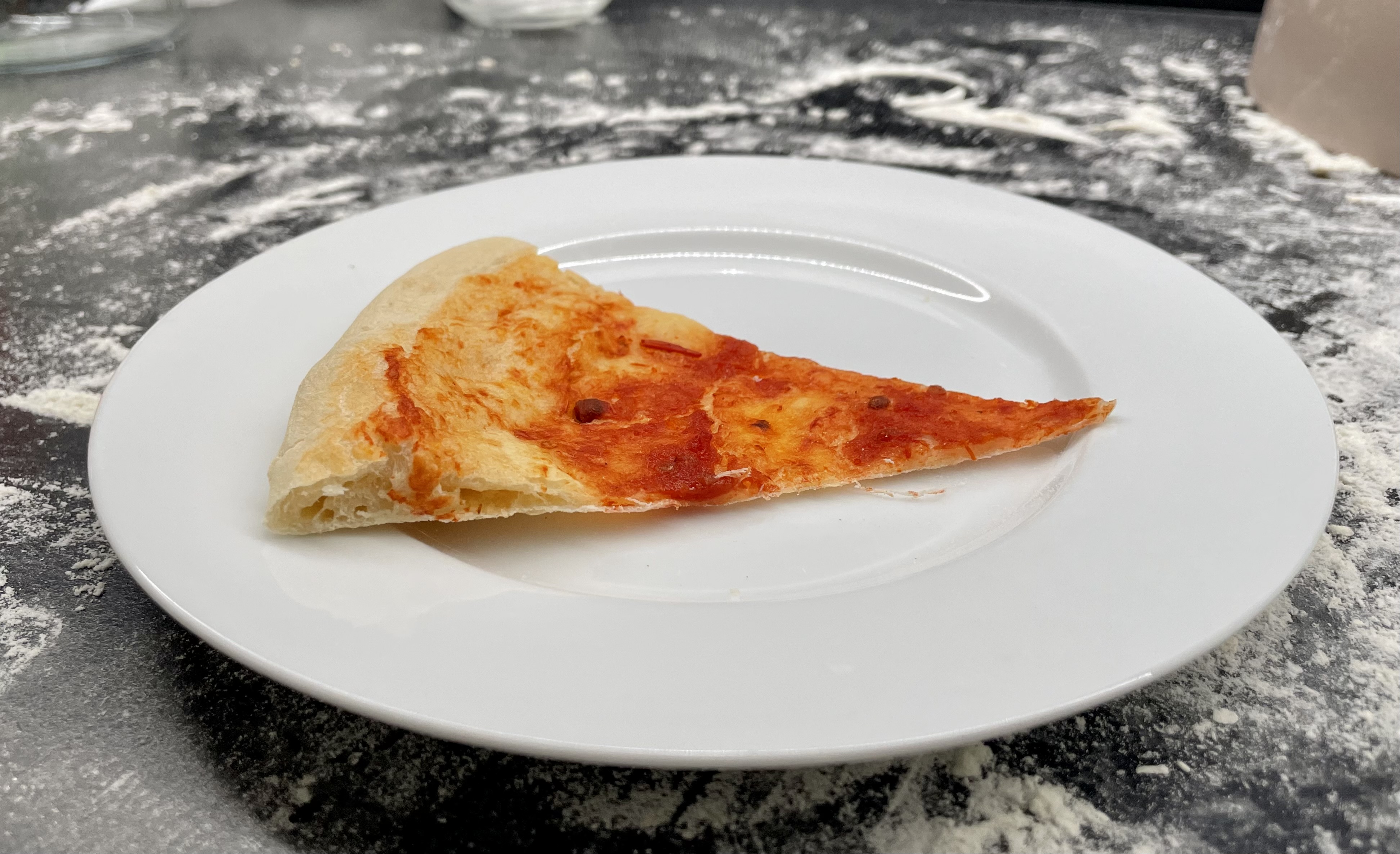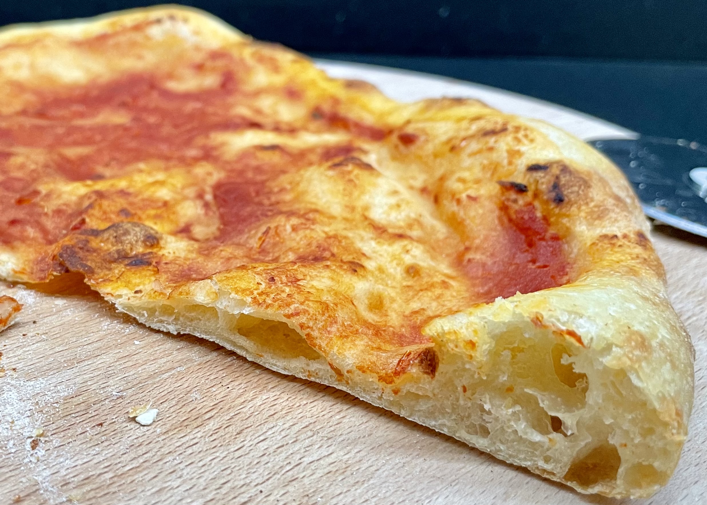 Po 24h těsto hodně nakynulo, připravujeme pizzu a při roztahování se na něm tvoří krásné bubliny. Lepek je velmi rozvinutý a máme ještě vyšší okraj, který je po skousnutí krásně vláčný a měkký. S trojúhelníkem pizzy si všemožně hrajeme, ohýbáme a krásně drží rajčata. Pružnost je zatím nejlepší ze všech testovaných vzorků. V minimální opečenosti vidíme, že těsto snese vyšší teploty neapolské pece.