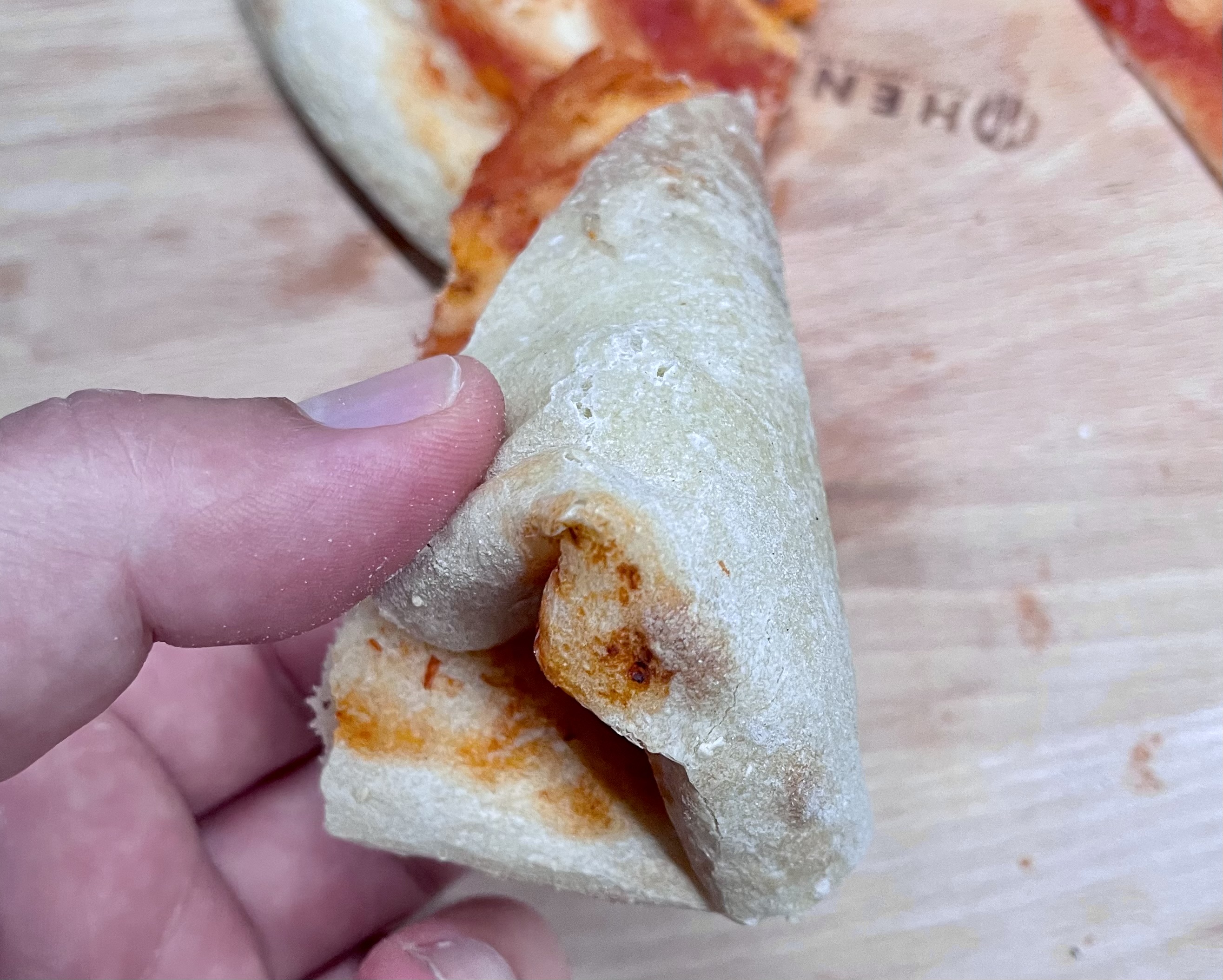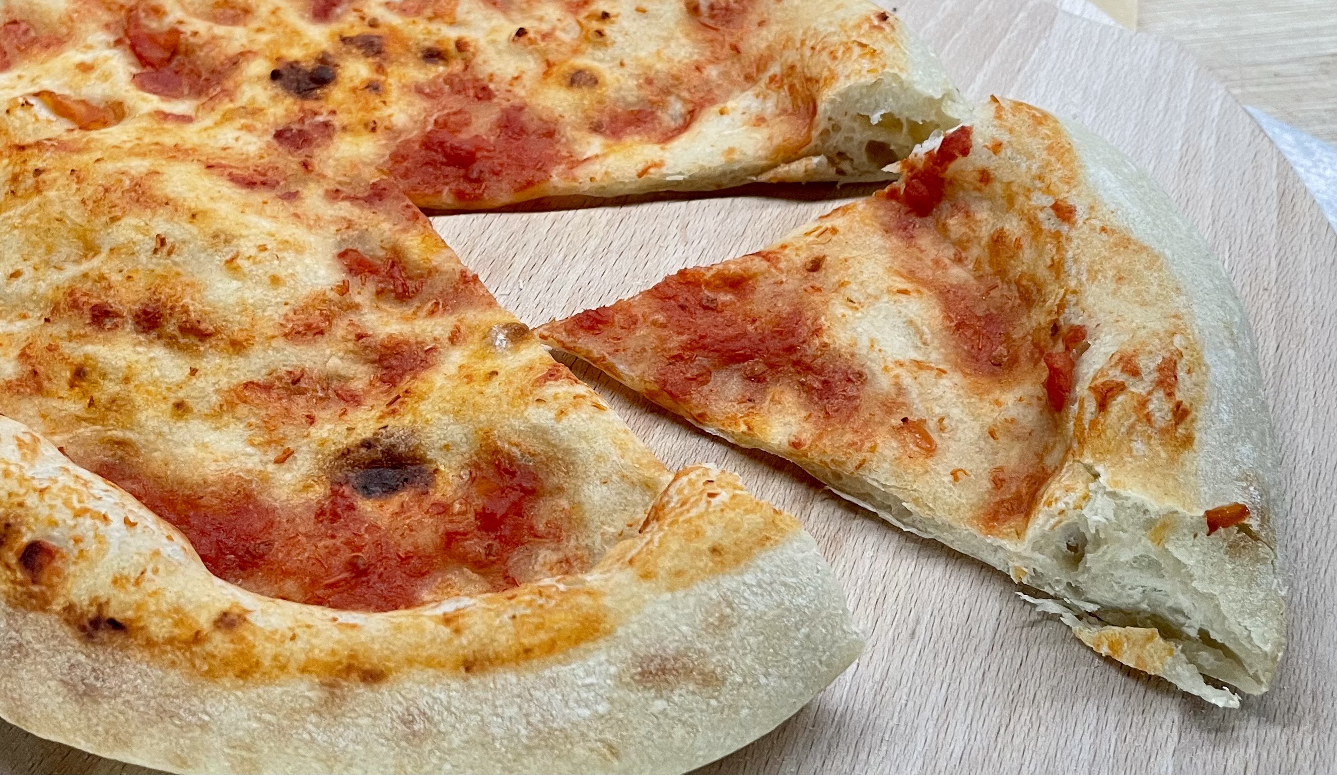 Po 4h jdeme na první pizzu. Těsto se nám trochu trhá, vyžaduje více podsypu a opatrnější postup. Po upečení máme mírně zvedlý okraj a základně rozvinutý lepek. Místy je pizza křehká a neudrží na sobě mnoho. Hrubost mouky se plně projevuje slabou pružností a těsto při ohybu praská.