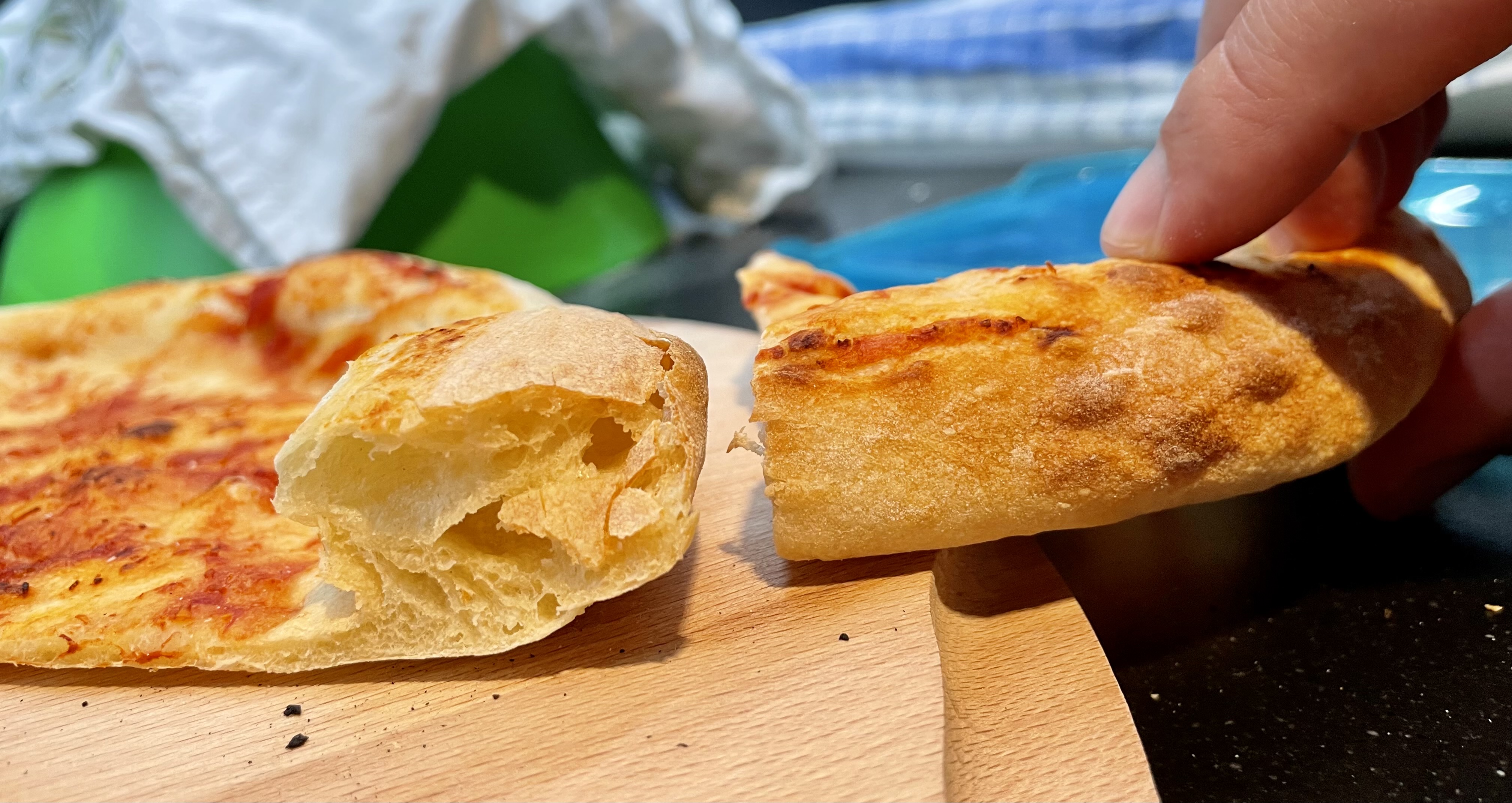 Po 4h si s těstem krásně hrajeme tažnost je skvělá a podobně i pevnost. I když máme těsto místy průhledné, udrží i tak rajčata a dáváme péct. Po upečení drží ono průhledné místo pohromadě a vidíte z druhé strany rajčata, která i v tomto stavu unese. Těsto tedy drží, lepek se rozvinul a okraje už jsou vyšší. Pizza je pružná, lze ji ohýbat, okraje drží a uvnitř příjemně vláčná.